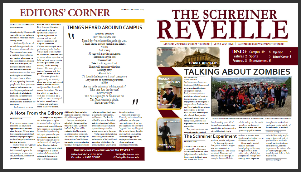 Jan '11 - May '14: Editor-in-Chief for The Mountainer, later renamed The Schreiner Reveille. Managed all layout development, editors and photographers.